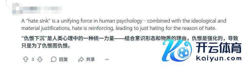 “不知谈你有莫得听过一个词,叫作念‘仇恨下千里’(hate sink)。这是根植在东谈主类情绪中的一种合并力量——它齐集了意志样子和物资方面的复杂要素。仇恨是一种很灵验的强化剂,为了互助里面,刽子手们偶然完全不错隧谈为了仇恨而仇恨。”