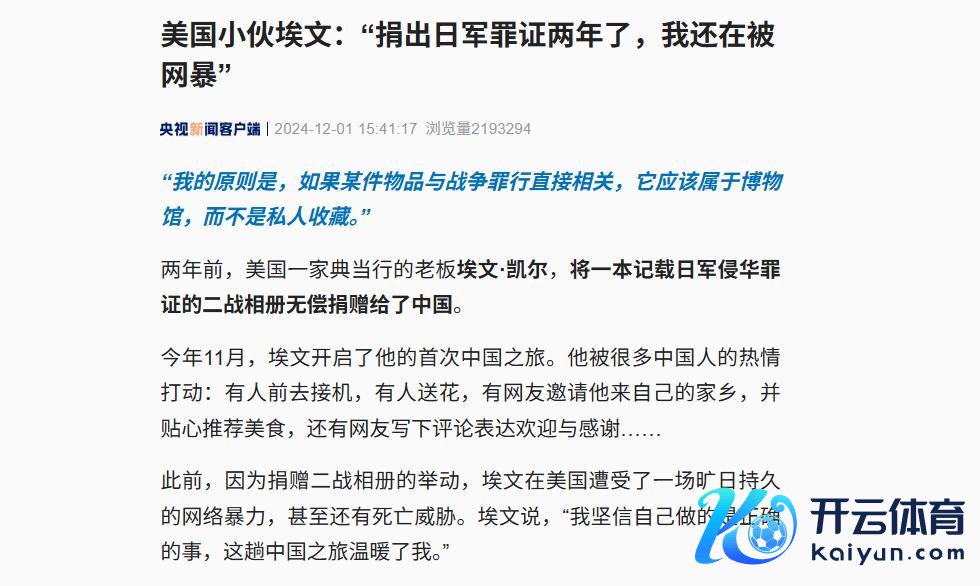 这样的说法究竟有几成属实?我不知所以,但我知谈这种暗昧之事日本一直在干,从来没停过。谁敢在好意思国揭露他们的历史暴行,他们就对谁痛下黑手。最近一个遭到针对的就是比年来在中国公论场上东谈主气很高的好意思国押店的雇主埃文·凯尔。他之前在汲取央视采访时就亲口说过,因为我方捐赠二战相册的举动,他在好意思国碰到了一场长年累月的收罗暴力,以致还有死一火挟制,况兼这场网暴持续了整整两年。在最严重的时候,他以致不得不穿上防弹衣、叫停了押店的交易,并因此产生了严重的情绪问题。