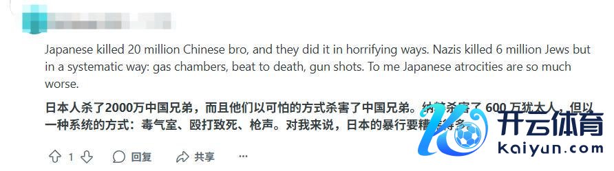 “哥们,你们知谈不?日本东谈主在二战中杀了2000多万中国东谈主,况兼用的都是你遐想不出来的可怕技能。纳粹天然也杀了600万犹太东谈主,但用的是系统的圭表:比如鸩杀和枪杀。比拟之下,我以为日本的暴行显着更恶劣。”