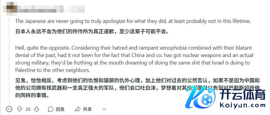 “想让日本东谈主真心谈歉?我以为你这辈子怕是等不到了。他们现时依旧仇外,依旧否定历史。要不是中国和她的邻居们有核弹、有硬拳头,他们怕不是早就学以色列那样,对巴勒斯坦痛下棘手了。”