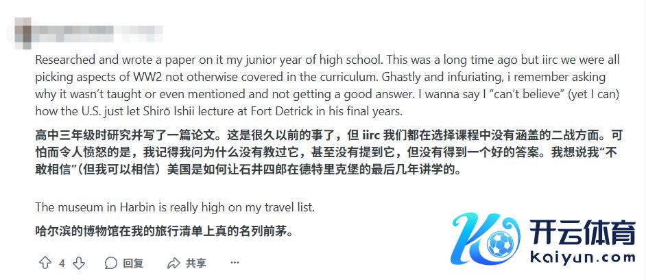 “我牢记我读高中的时候,也曾写过一篇731的论述。那时憨厚让寰球自选二战的冷门课题当课题,我选了731。我之前从来没搏斗过,查完历史尊府之后我吓坏了,也气坏了。我问憨厚:为什么咱们好意思国的历史教材里对此一字不提?成果憨厚也说不出个是以然来。我自后还得知,好意思国竟然让晚年的石井四郎到德特里克堡来授课,这事让我气得差点没一口老血吐出来。我照旧想好,如若那天去了中国,哈尔滨的侵华日军第七三一部队罪证陈列馆我一定要去,它排在我旅行清单上的第又名。”