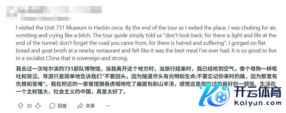 “身为一个中国东谈主,我来告诉你们。我去过哈尔滨的731部队罪证陈列馆。走出来那一刻,我喘不外气,边吐边哭。导游只说了一句话:‘别回头,上前走,出口有光,有东谈主间炊火,有国破家亡;别健忘,来时路,有民族厄运,有国恨家仇。’我自后在傍边的一家饭店吃了烙饼配羊汤,我以为那是我东谈主生中最佳的一顿饭。今天能生存在一个主权强大的社会主义中国,我以为这就是我最大的福泽。”