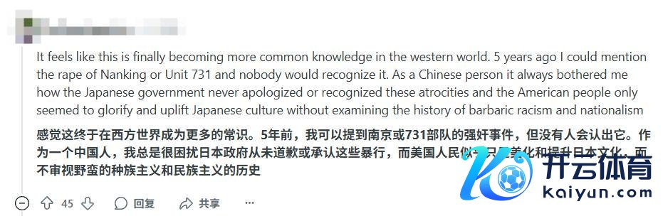 “很无奈,那些对于日本的诬蔑通晓,在西方照旧渐渐成了某种‘知识’。5年前,我一提南京大屠杀或731部队,身边就没几许东谈主知谈的。身为一个好意思籍华东谈主,这让我很难熬:日本政府从来莫得谈过歉;好意思国东谈主只顾着追动漫、吃寿司,却从不正视那段种族主义和军国主义的黑历史。”