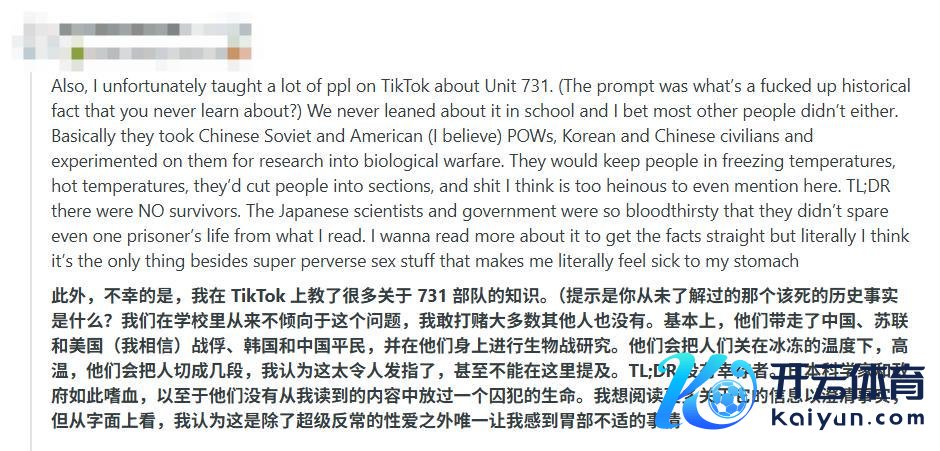 “我在洋抖上跟许多东谈主讲了731部队的行状。说真的,讲得越多我越后悔。话题就叫#你不知谈的操蛋历史究竟是怎么一趟事# 731干的事西方学校是不会教的,我猜大多数西方东谈主也没兴味去学。它们抓了中国、苏联和好意思国的战俘,还有中国和朝韩的子民,拿来作念生物战践诺。它们把东谈主放进寒冬或极热的环境,还把东谈主切成块……有些事太恶心了,我都不知谈怎么跟你们开这个口。总之,莫得一个俘虏能从它们的魔掌存活下来的。那些日本科学家和日本政府极度残忍嗜血。除了德国东谈主拍的德国骨科动作片之外,独逐个个让我看吐了的历史尊府就是731的暴行。”