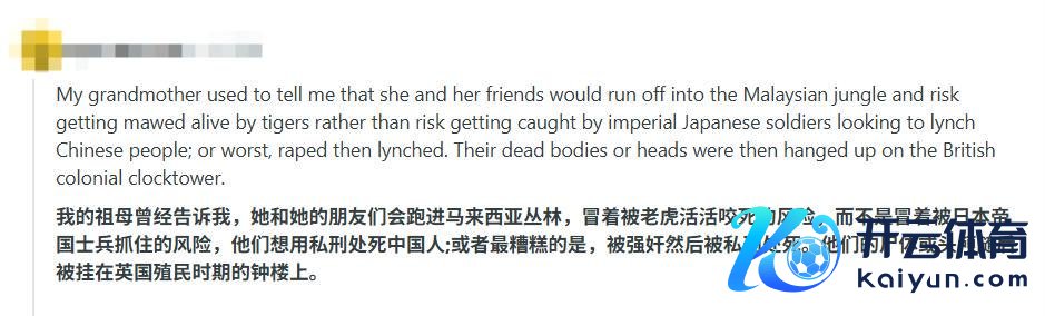 “小时候我奶奶也和我说过,在日寇入侵的时候,她和她一又友会逃进马来亚的森林里,她们承诺冒着被老虎咬死的危机,也不肯被日本鬼子收拢。这些鬼子极度仇视华东谈主,多样令东谈主发指的私刑那都是家常便饭,先奸后杀的暴行不胜胪列。华东谈主游击队也不给它们惯着,收拢这群杀千刀的就是斩首示众,把它们的脑袋或尸首吊挂在英国殖民时期的钟楼上。”