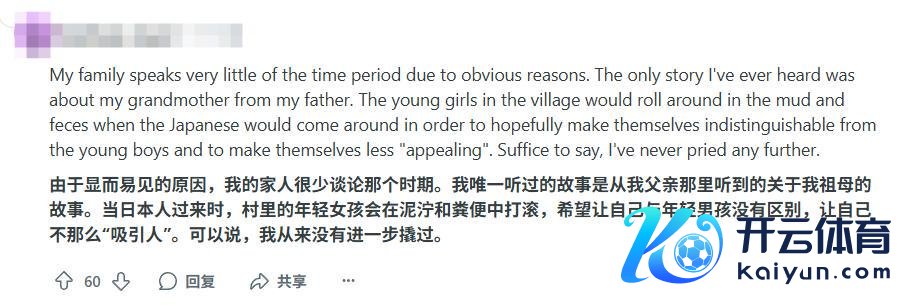 “你说的情况我家里也有,但是家里东谈主很少说起那段恐怖时期,原因你们都懂的。我只听过一个故事,是我爸爸讲的,对于我奶奶的。听说在阿谁时候,村里的年青小姐一听日本东谈主来了,就会吓得提前跑去猪圈里打滚,把我方弄得臭熏熏的,然后祷告我方跟那些男孩子看起来没啥区别。在小鬼子眼前,一个年青小姐长得‘太迷惑东谈主’是一种富裕恐怖的悲痛。我听完之后就噎住了,再也没敢多问。”