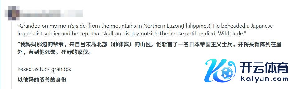 “我外曾祖父,一个狂野到不行的老翁子,当年生存在菲律宾吕宋岛北部的山区。他也曾亲手砍下过一个日本鬼子的脑袋,并那玩意像灯笼相似挂在他的屋外展示。这颗鬼子头直到他升天之后才被我家里东谈主取下来。”
