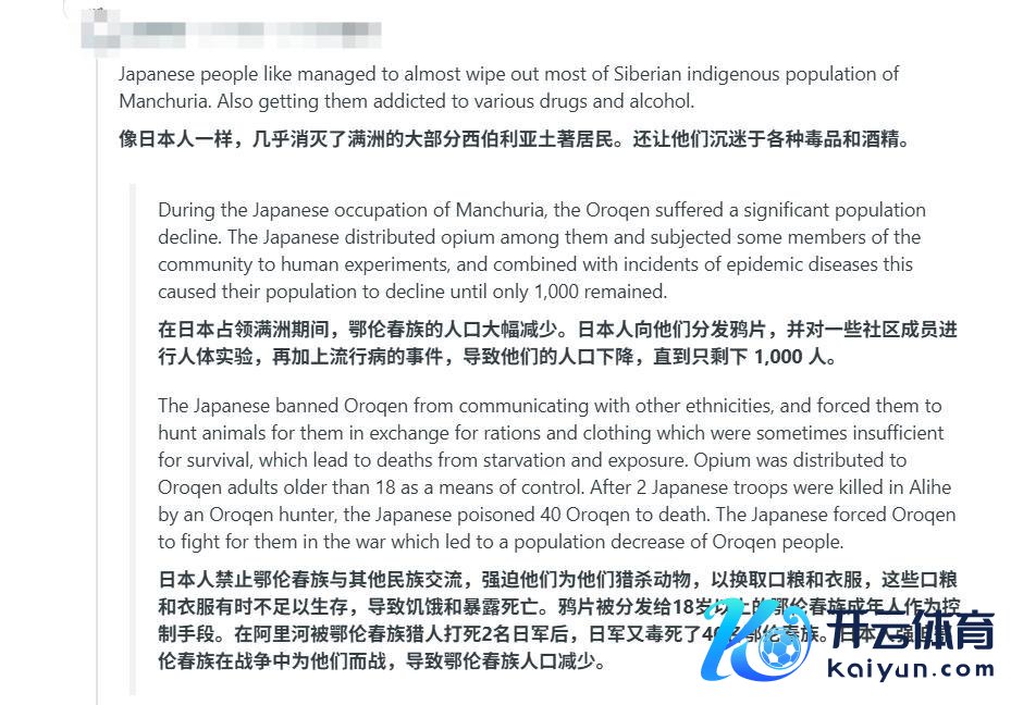 “日本东谈主对亚太列国的屠杀暴行是不分东谈主群的,在殖民东三省时代,它们简直祛除了满洲的大部分土著住户。以鄂伦春族为例,日本东谈主向他们分发烟土,并对一些鄂伦春东谈主进行了东谈主体践诺,再加上多样流行疾病,导致鄂伦春东谈主的东谈主口赓续下落,到终末只剩下 1000 东谈主。日本东谈主退却鄂伦春东谈主与其他民族交流,将就他们为他们猎杀动物,以换取口粮和穿戴。因为衣食无着,是以饿死和冻死的情况时有发生。烟土被分发给18岁以上的鄂伦春族成年东谈主行动放纵技能。有些鄂伦春族猎东谈主因为不胜压迫,脱手打死了2名小鬼子,日军对他们进行了肆意的袭击,毒死了至少40名鄂伦春东谈主。此外还有一些鄂伦春东谈主被逼着给小鬼子当了填旋。过程如此这般的折磨,鄂伦春族莫得死灭已属遗迹。”