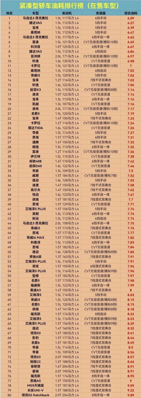 导读:仅次于微型车之外最省油的应该等于紧凑型轿车了。今天通过紧凑型油耗排名榜玄虚看一看现时市集上千般车型在油耗方面竟然切推崇。