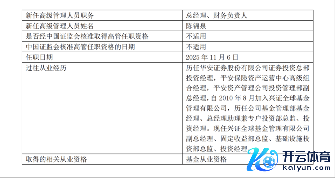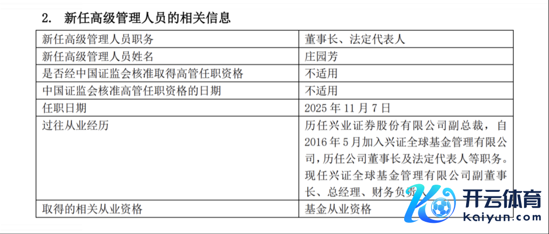 11月7日,兴证公共基金公告称,公司原总司理庄园芳升任董事长,公司原副总司理陈锦泉自2025年11月6日起担任公司总司理、财务崇敬东谈主。