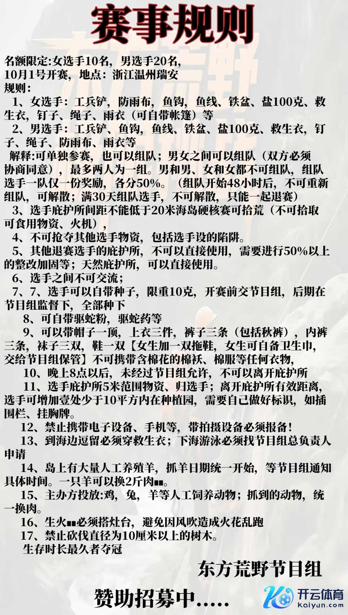 赛事修复方面,冠军可获5万元奖金,选手相持满30天可获取6000元奖励,超出30天的部分,每天稀罕增多300元。根据比赛官方账号公布的赛事限定,比赛时间选手谢却拾取可食用物质,主理方在岛上投放鸡、兔、羊等东说念主工饲养动物,选手持到动物可换肉。