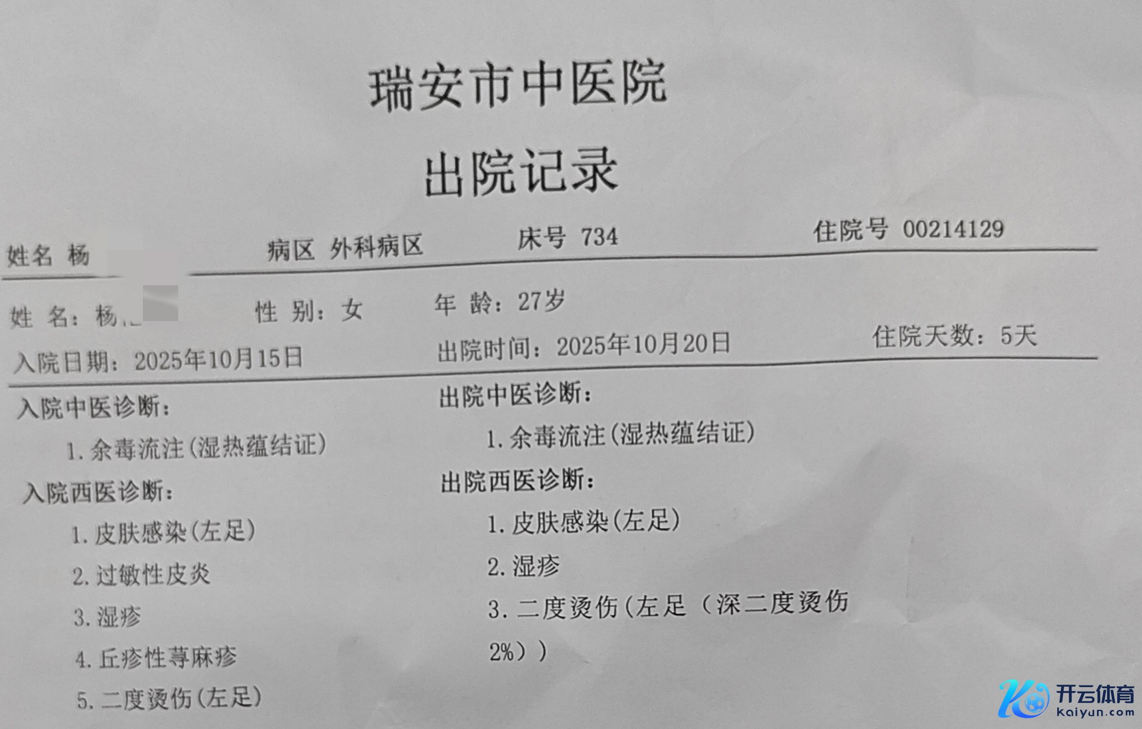 10月15日,主理方接洽船只将她送到瑞安的病院罗致救援。杨又串提供的会诊讲述自满,住院时左脚深二度烫伤,因在旷野生计,身上还出现了过敏性皮炎、湿疹和丘疹性荨麻疹。“我的伤皆备是因为安全员配备不及才拖了几天,何况从我受伤于今,医疗费都是我我方垫付,主理方对我的伤情莫得侵犯过。”