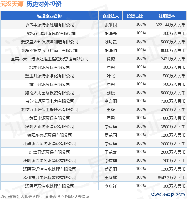 本站音书,凭据天眼查APP泄露,武汉天源(301127.SZ)新增一说念对外投资事件,被投资公司为永善丰源浑水惩办有限公司,法定代表东说念主义维民,投资占比为100%。该公司从事水的分娩和供应业欧洲杯体育,注册成本为3221.44万东说念主民币。当今,武汉天源共存在对外投资56项,投资占比前20的时势见下表: