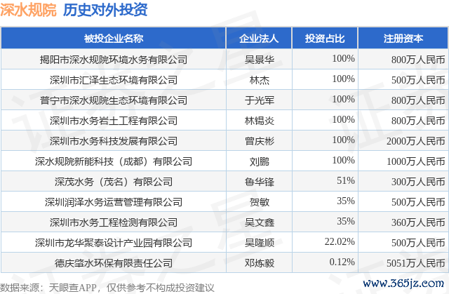 本站讯息,凭证天眼查APP潜入,深水规院(301038.SZ)新增一都对外投资事件,被投资公司为深茂水务(茂名)有限公司,法定代表东谈主鲁华锋欧洲杯体育,投资占比为51%。该公司从事水利惩办业,注册成本为300万东谈主民币。现在,深水规院共存在对外投资11项,详见下表: