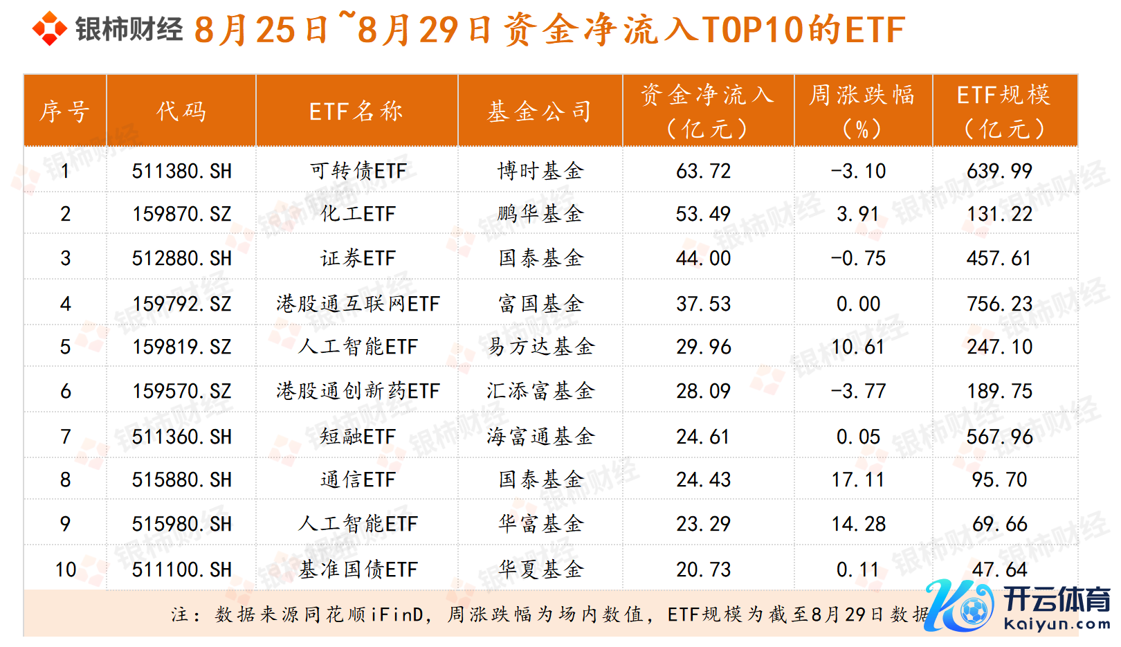 从单只ETF资金流向来看,天然上周可转债行情出现大幅调停,可转债ETF上周着落超3%,然则仍有超60亿元资金流入该产物。此外,化工ETF近日热度不小,该产物上周得回53.49亿元资金净流入,铁心8月29日范围已冲破百亿元大关。