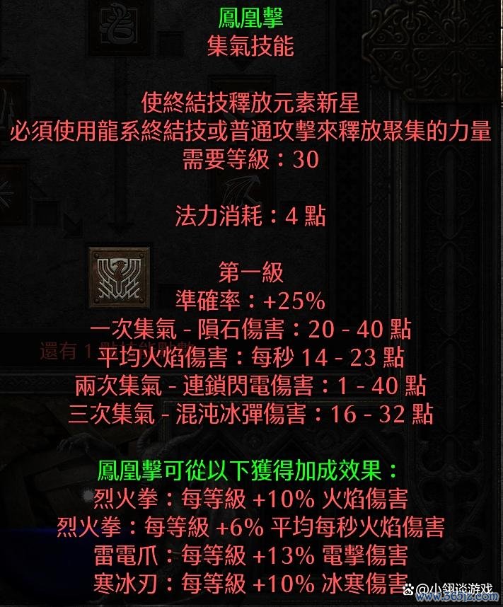 原版的凤凰击,集气手感相等累积,每个球对应的属性不同。改版之后,无脑集3球,即可同期领有陨石、连锁闪电、以及混沌冰弹的殊效伤害。