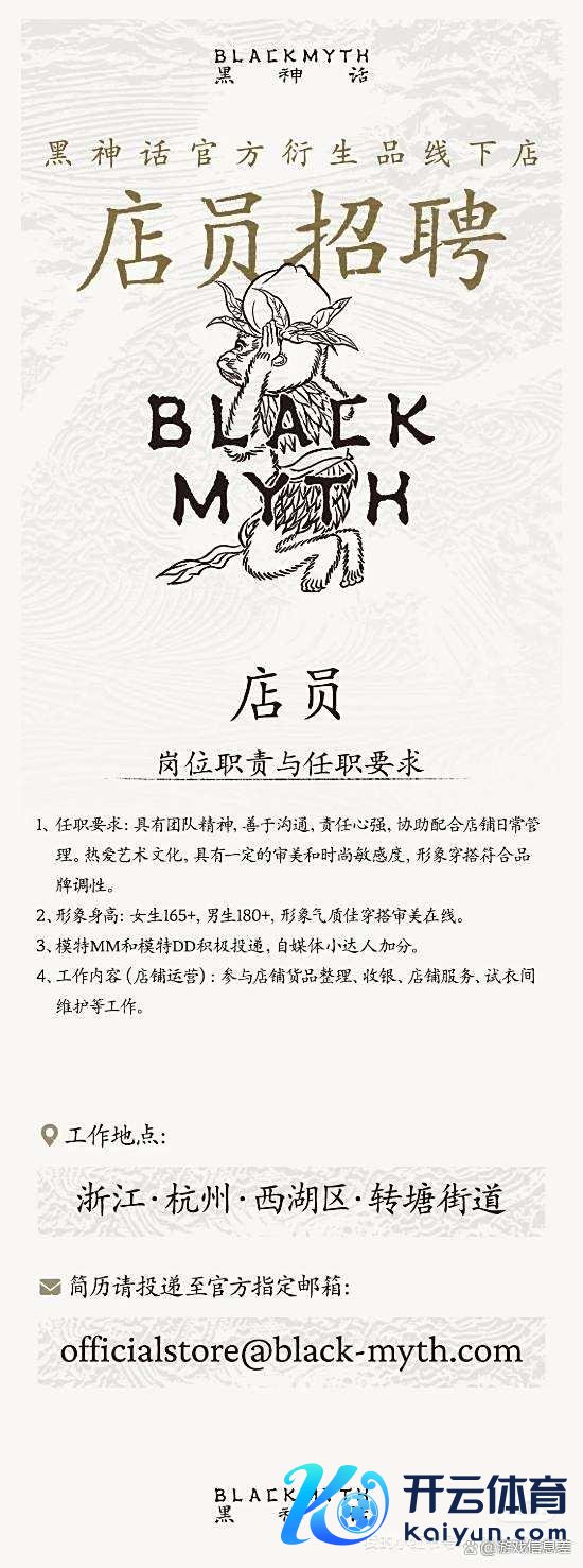 再说说此次招聘的具体要求,除了惯例的货物整理、收银这些店铺运营责任,还有两个十分点:女生身高≥165cm,男生≥180cm,况且得嗜好艺术文化、审好意思在线。不少玩家看到身高要求王人玩弄 “念念应聘先量身高”,但真对《黑神话》多情愫的东说念主,揣测照旧会念念去试试。
