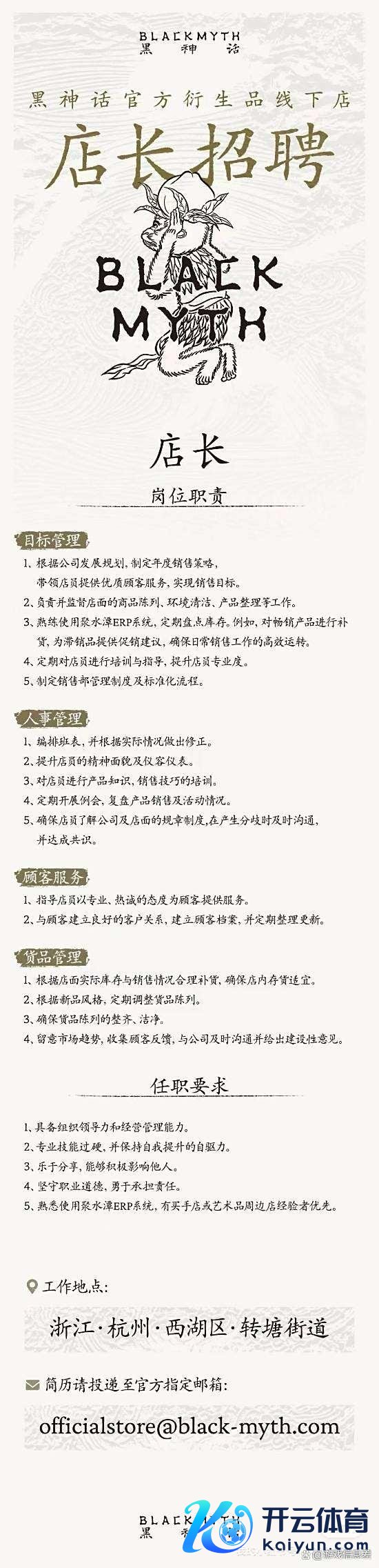 你是不是还在为没抢到八戒公仔缺憾?杨奇倏得扔出杭州新动作,平直勾住玩家防备力! 本年早些工夫游戏科学官宣 “黑神话 BLACKMYTH”,当作《黑神话》唯独官方品牌,后续不停上新左近。78 元的八戒毛绒挂件上架就售过万,499 元的火照黑云炽毯更是要等 90 天预售,玩过的王人懂,抢左近比肝副本还长途。 日前《黑神话》系列游戏总监杨奇,平直在小红书发了则标注 “劲爆” 的动态,实践是为 “黑神话 BLACKMYTH” 的杭州线下空间招聘。店铺选址在西湖区转塘街说念,要招店长和伴计两个岗亭。对杭